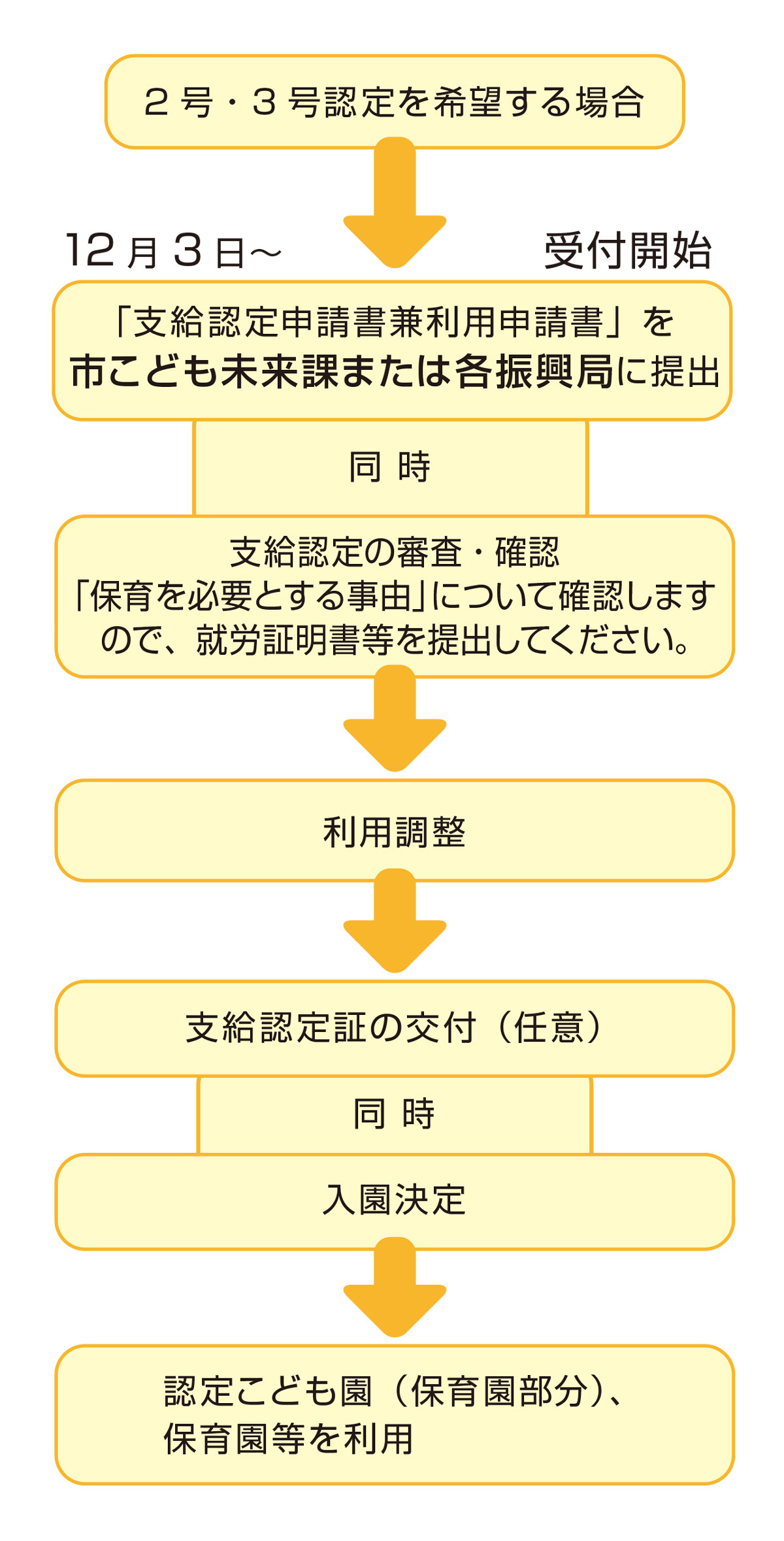 | 3号認定 | 満3歳未満で、「保育の必要な事由」に該当し、認定こども園(保育園部分)、保育園、小規模保育事業等での利用を希望される場合 |